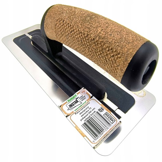 Dzięki narożom zaokrągleniom oraz idealnie gładkiej powierzchni, paca doskonale rozprowadza masę po powierzchni nie pozostawiając rys. Profilowany uchwyt z korka osadzony jest na stopce z poliamidu.