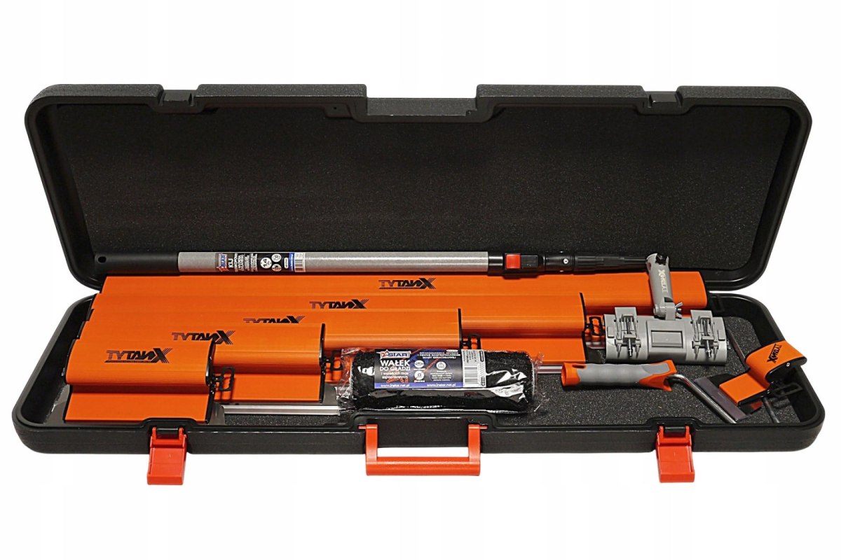 Zawartość: Szpachle wykończeniowe TytanX Professional 800 mm, 600 mm, 400 mm, 250 mm, 100 mm. Kij teleskopowy z włókna szklanego 1,4 m. Uchwyt (adapter) do szpachli wykończeniowej. Wałek do gładzi 25 cm. Nóż 600 mm. Walizka TytanX
